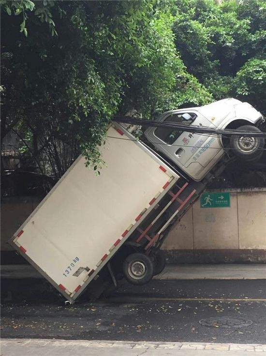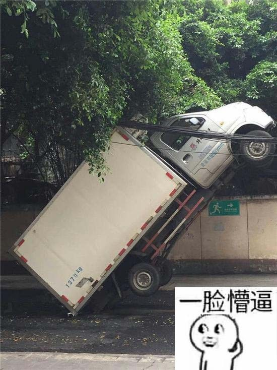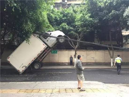 成都一老司机灵车漂移俗话说 男人看得住 母猪会上树 母猪上树只是听过没有见过 那么 货车上树肯定前所未闻 然而真的发生了 。。。